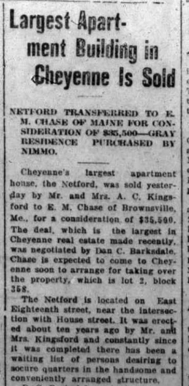 This magnificent brick structure located in the Rainsford District of downtown Cheyenne was built in 1911 by A.C. Kingsford and his wife, Nettie. In 1919 Elijah Marden Chase and his wife Ada Gerry Chase set out across America seeking investment opportunities. They discovered The Nettford during a train trip stop and immediately fell in love with, and purchased, the three story Greek Revival "Mansion". My name is Matthew Marden Hanger and my great grandparents are Elijah and Ada Chase. The Nettford has now been in our family for over 100 years.